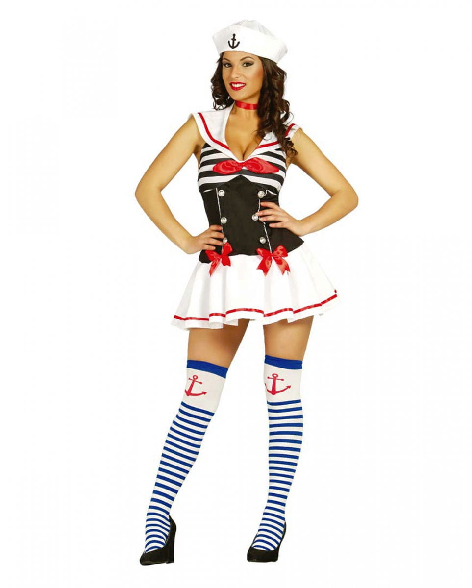 Schwarz-weißes Matrosin Kostüm für Fasching Heiße Seefahrerin Verkleidung mit Schiffchen für deinen Auftritt als Navygirl Ahoi! Mit unserem verführerischen schwarz-weißen Matrosin Kostüm für Fasching wirst du auf den nächsten Karnevals-Feiern ud maritimen Mottopartys garantiert so einigen männlichen Kollegen den Kopf verdrehen und zum absoluten Eyecatcher werden! Das schwarz-weiße Matrosin Kostüm für Fasching besteht aus einem Minikleid und einer Mütze. Das Kleid mit angenähtem Kragen und drei roten Zierschleifen erinnert optisch sofort an die typischen Marine-Uniformen, was durch die Farbgebung und die klassischen Streifen noch betont wird. Das Seebärin-Kleid ist tailliert geschnitten und weist mittig eine angedeutete Corsage auf, die mit zwei Knopfleisten samt silberner Knöpfe verziert wird. Zwei Bänder an den Seiten dienen dazu, die Seefrau-Verkleidung auf die gewünschte Enge zu binden. Ein weißes Matrosen-Schiffchen mit aufgedrucktem Anker rundet deinen Auftritt als Matrosin perfekt ab. Lieferumfang: 1x Matrosin Kostüm für Fasching Inhalt: 1 Kleid, 1 Mütze (Halsband, Strümpfe und Schuhe nicht inkl.) Farbe: schwarz/weiß/rot Größe: S, M, L Material: 100% Polyester Abmessungen XS – S 36/38 M 38/40 L 42/44 XL 44/46 Brustumfang ca. 80-90 cm ca. 93-96 cm ca. 99,5-103 cm ca. 108-115 cm Taillenumfang ca. 67-70 cm ca. 73-75 cm ca. 80-84 cm ca. 91-100 cm Hüftumfang ca. 94-97 cm ca. 99,5-102 cm ca. 106-110 cm ca. 110-125 cm Achtung: Der Artikel ist ein Kostüm für Erwachsene und kein Spielzeug. Nicht für Kinder unter 3 Jahren geeignet. Kann Kleinteile enthalten, die verschluckt werden können. Es besteht dadurch Erstickungsgefahr. Vor Feuer und Flammen entfernt halten.