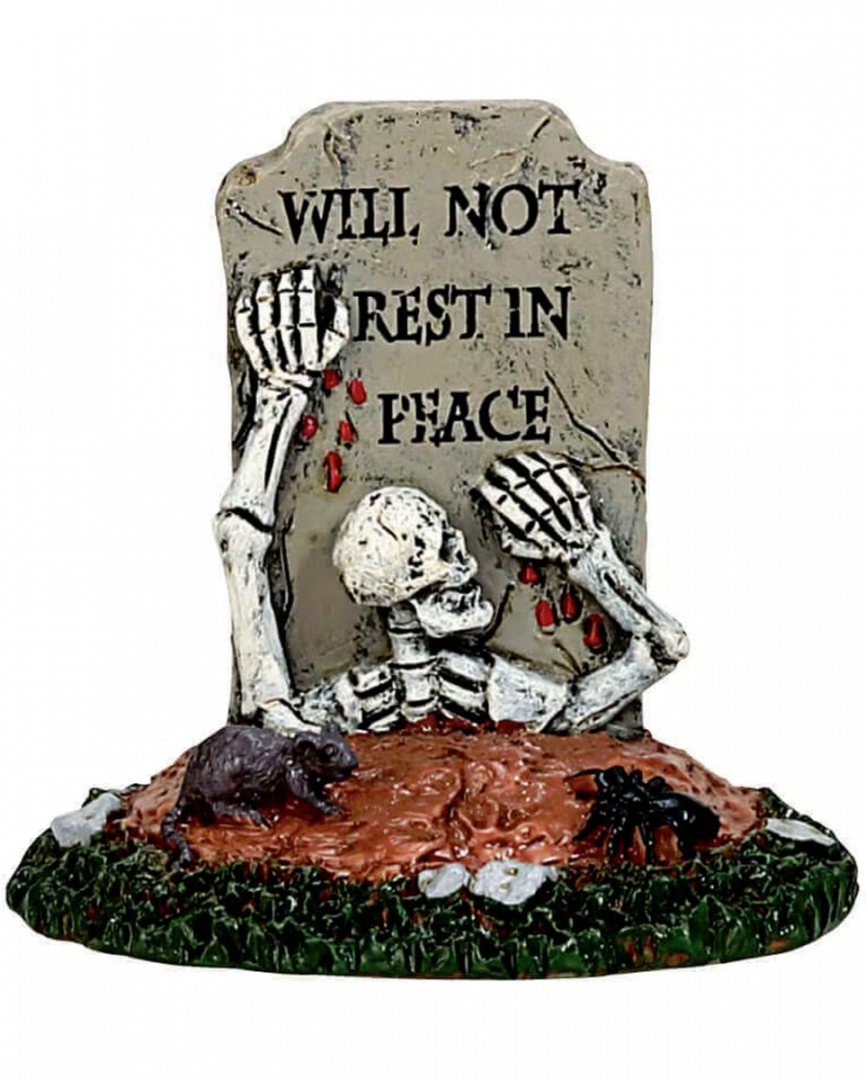 Escape from a Grave – Lemax Spooky Town Skelett am Grabstein als Halloween Dekoration Die Escape from a Grave – Lemax Spooky Town Figur ist ein Muss für Fans von Horror und Halloween. Das unheimliche Skelett buddelt sich aus seinem Grab, um in Spooky Town Halloween mit seinen Freunden zu feiern. Der Grabstein zeigt die Aufschrift ",WILL NOT REST IN PEACE",. Darunter ist ein Gerippe zu erkennen, welches sich mit den Händen am Grabstein festhält. Der Artikel besteht aus Kunststein und ist detailreich gearbeitet sowie von Hand bemalt. Lieferumfang: 1 x Escape from a Grave – Lemax Spooky Town Farbe: Grau, Weiß, Braun, Grün, Schwarz, Rot Größe: ca. 5,6 x 5,7 x 4,3 cm Gewicht: 40g Material: Polyresin (Kunststein) Der Artikel ist ein Dekoartikel. Von Feuer und offenen Flammen fernhalten.