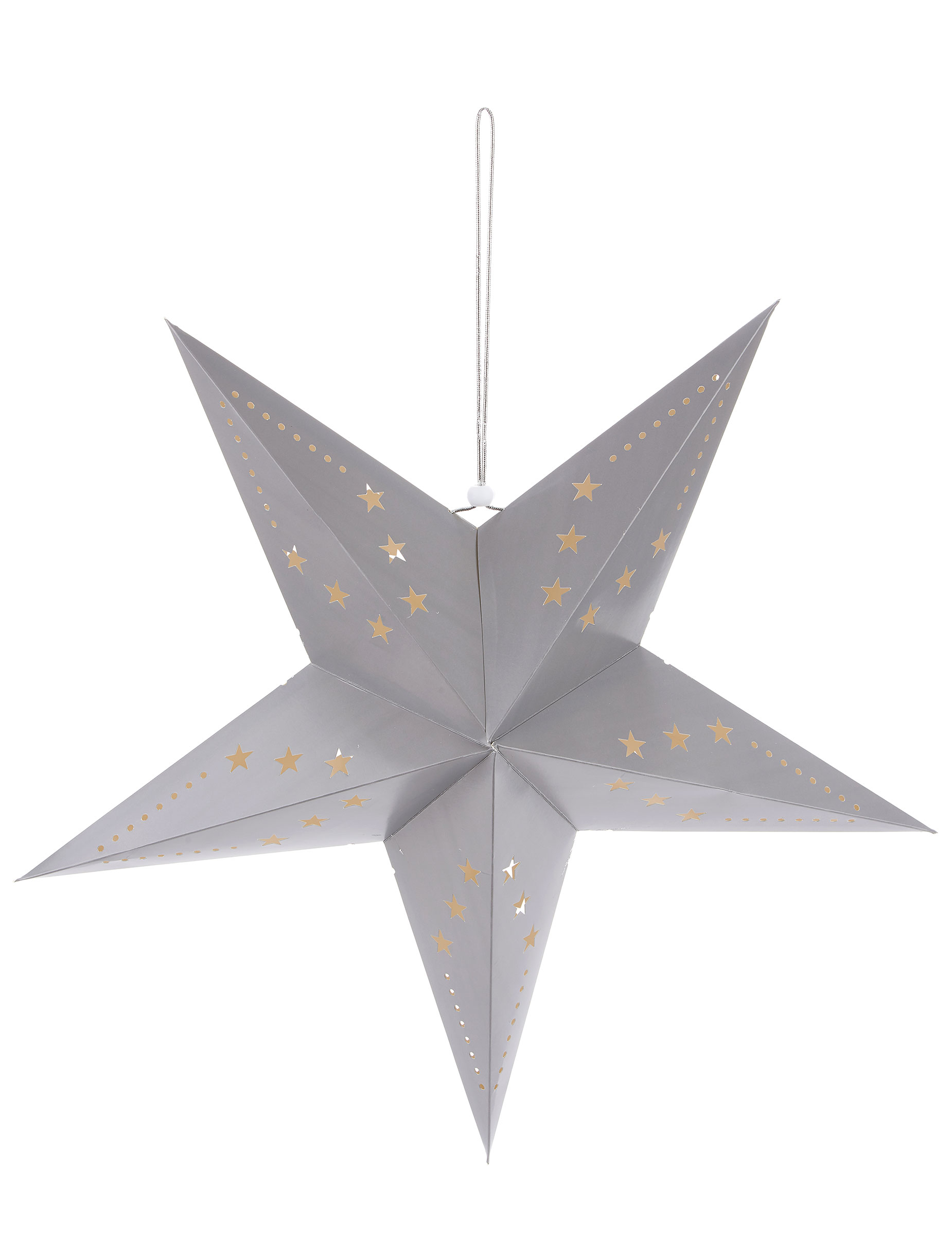 Diese hängende Dekoration hat eine Sternenform und einen Durchmesser von 60 cm. Sie verfügt über einen Faden in Silberfarben, durch den die Deko überall aufgehängt werden kann. Die Dekoration ist zudem zusammenfaltbar und dadurch einfach zu transportieren. Dieser Stern in Silbergrau ist der ideale Deko-Schmuck für die nächste Feier zum Neujahr oder bei einer Baby Party!