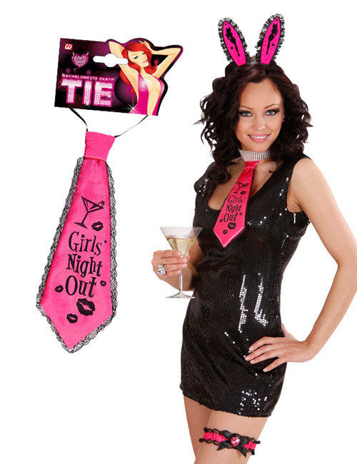 <Â Copyright by Widmann S.R.L.> Ein Junggesellinnenabschied steht an und Sie überlegen noch, wie Sie sich und die anderen Partymäuse accessoiretechnisch aufpeppen können Mit dieser frechen Girlie-Krawatte gelingt das im Handumdrehen! Diese schicke Party-Krawatte kommt in einem knalligen Pink und überzeugt durch den Girls Night Out-Aufdruck, der zusätzlich von einem Cocktail-Glas und Kussmündern geschmückt wird – ein witziger Anblick, der keine Fragen darüber offen lässt, was Sie und Ihre Mädels vorhaben! Die Damenkrawatte ist bereits gebunden und zusätzlich am Rand mit schwarzer Spitze verziert. Der nächste JGA oder der Damenabend kann mit diesem sensationellen Party-Accessoire kommen! Weitere fabelhafte JGA-Artikel finden Sie in unserem Shop!